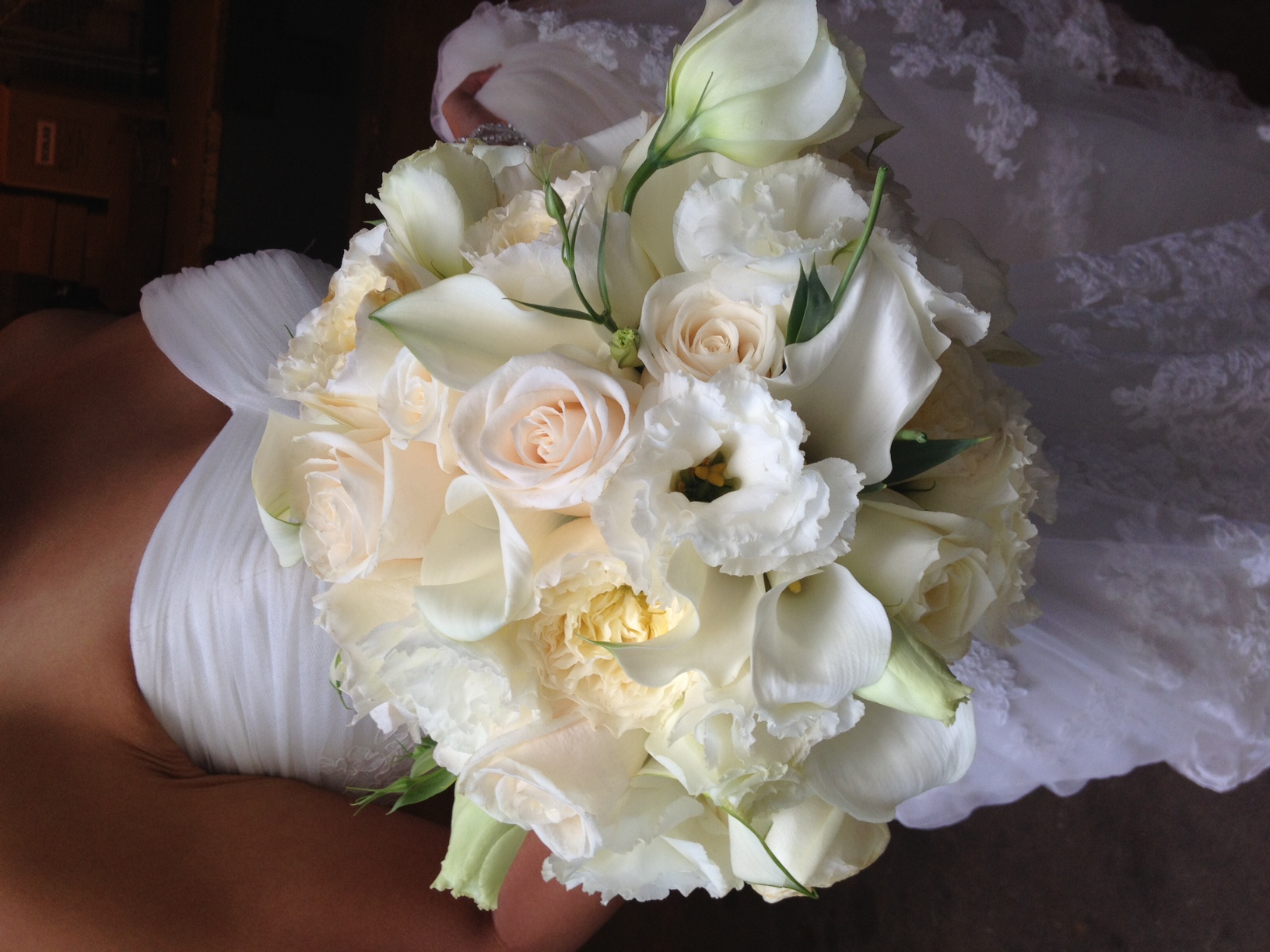 We had a beautiful wedding at the National Conference Center in Leesburg in the beginning of fall. We only have photos of the bouquets here – as soon as we get the professional photos back – we will let you know! I loved her gorgeous and timeless bridal bouquet (along with her incredible dress!!!) which was comprised of white lisianthus and calla lilies with ivory vendela roses and ivory garden roses.