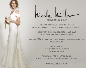 Ahh – the lovely Nicole Miller is having a Bridal Trunk Show next weekend (the 27th and 28th) at Tysons – not to be missed! We are huge fans of Nicole Miller here at Elegance & Simplicity! Katie Martin actually bough her wedding gown from Nicole Miller in Tysons! Let us know if you pick out your gown! Call to make an appointment today – 703-821-1630!