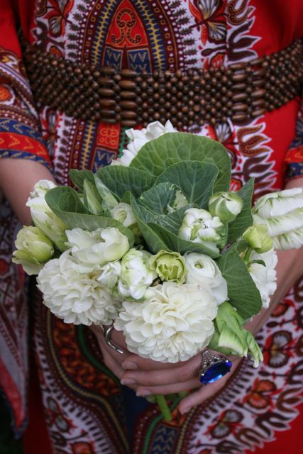 Above is one of the bridesmaids (every one of them wore their own dress – just adorable and in different colors) bouquets with ornamental cabbage, weber parrot tulips, green anemones and dahlias.