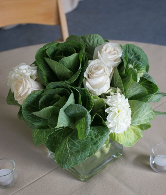One of the centerpieces for the larger tables were comprised of ornamental cabbage, dahlias and roses.