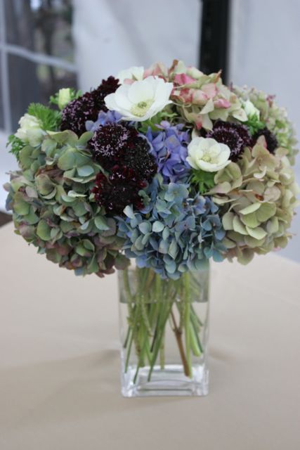 Gift table arrangement with hydrangea, anemones and scabiosa