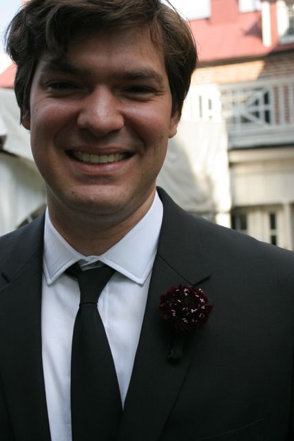 The groom wore a fun suit and this wonderful dark purple scabiosa boutonniere!